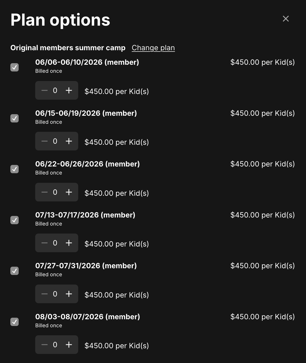 Select the week(s) and number of children you want to attend and select "Complete plan change"
