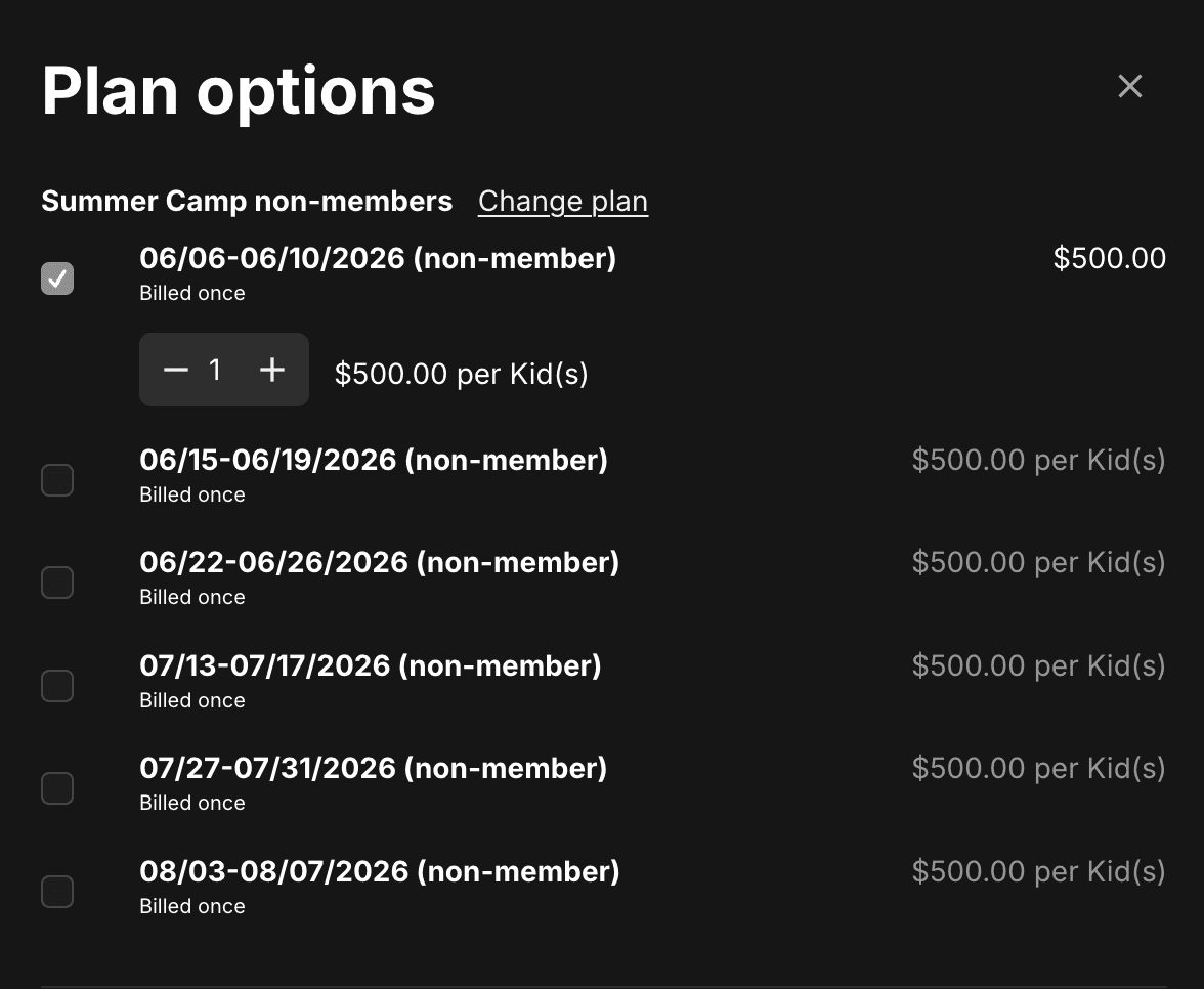Select the week(s) and number of children you want to attend and select "Complete plan change"